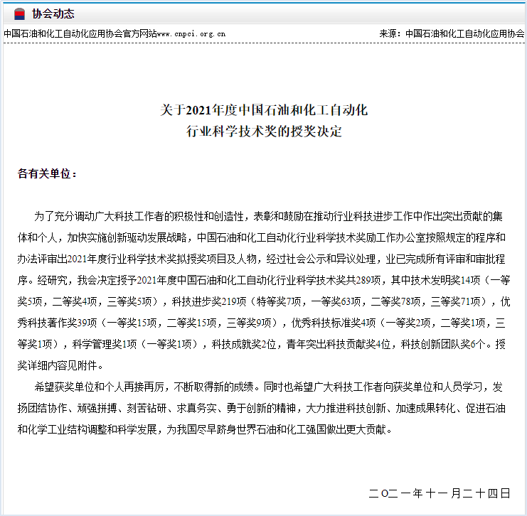 近日,由中國石油西南油氣田分公司天然氣研究院主持,四方光電參與的“天然氣中硫化物光譜檢測技術(shù)研究及應(yīng)用”項目榮獲2021年度中國石油與化工自動化行業(yè)科技進(jìn)步一等獎。中國石油與化工自動化行業(yè)科學(xué)技術(shù)獎是經(jīng)國家科學(xué)技術(shù)部批準(zhǔn)(國科學(xué)社證字第0109號)設(shè)立的,主要評選在石油與化工自動化領(lǐng)域推動行業(yè)科技進(jìn)步工作中做出突出貢獻(xiàn)的集體和個人。 西南油氣田分公司天然氣研究院是我國天然氣相關(guān)標(biāo)準(zhǔn)的起草單位,其主持的“天然氣中硫化物光譜檢測技術(shù)研究及應(yīng)用”項目于2021年6月通過中國石油和化工自動化應(yīng)用協(xié)會組織的專家委員會鑒定,鑒定結(jié)論為國際領(lǐng)先水平。該項成果填補(bǔ)了我國在天然氣組成分析技術(shù)領(lǐng)域的空白,解決了以往天然氣中硫化合物取樣失真、信號濃度低等技術(shù)難題,研制了激光拉曼天然氣在線分析儀及配套的氣體標(biāo)準(zhǔn)物質(zhì),保障含量天然氣安全平穩(wěn)開發(fā)、凈化處理、輸送和高效環(huán)保利用,助力我國天然氣工業(yè)高質(zhì)量發(fā)展。 四方光電依托承擔(dān)的國家重大科學(xué)儀器開發(fā)專項“激光拉曼光譜氣體分析儀”(2012YQ160007)積極參與到該項目的研究中。同時,公司還參與了由中國石油西南油氣田分公司天然氣研究院主持的石油行業(yè)標(biāo)準(zhǔn) SY/T 7433《天然氣的組成分析 激光拉曼光譜法》 的起草工作?!疤烊粴庵辛蚧锕庾V檢測技術(shù)研究及應(yīng)用”項目是在拉曼光譜測量天然氣主要成分的基礎(chǔ)上,對微量元素分析的進(jìn)一步拓展。